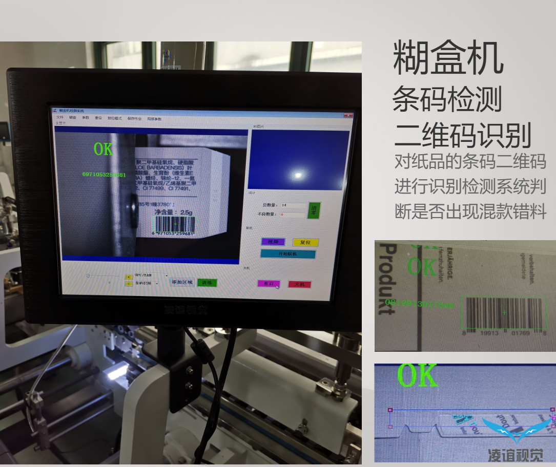 通常包裝廠生產的紙盒產品在出廠交貨前一道工序為粘盒,凌誼視覺提供的糊盒機防混貨檢測系統是加裝在糊盒機臺上實現在線檢測,防止粘盒混貨,識別條碼防呆,保障產品出貨品質。該粘盒防混貨檢測系統基于CCD機器視覺識別技術,采用高速進口工業相機設備,通過高速反應的光電感應觸發,對每一個包裝盒子上的圖文、條碼、料號信息識別實時傳輸給由我公司自主研發的凌誼視覺檢測系統,由視覺檢測系統進行數據對比校驗后判斷是否存在混貨串貨的情況,當檢測到混貨產品時,系統實時進行聲光報警同時由停機模塊輸出停機信號控制糊盒機停機,把混貨產品停在相對固定的位置,方便查找和取出。